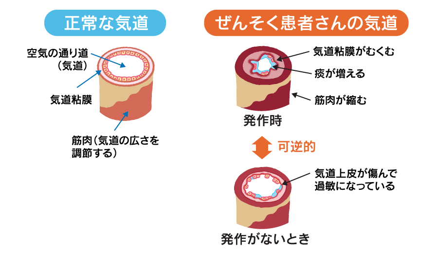 気管支ぜんそくは、空気の通り道(気道)に慢性の炎症が起こることで気管支が敏感になり、発作的に気管支が狭くなることを繰り返す病気です。日本では、大人の10%に「ぜんそく」があるといわれています。