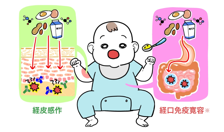 赤ちゃん期は皮膚トラブルが多く、湿疹がきっかけでアトピー性皮膚炎や食物アレルギーを発症することがあります。皮膚からアレルゲンが体に入り込む「経皮感作」を防ぐことは、アレルギーマーチを防ぐ第一歩。皮膚症状が1~2週間以上続くとき、どんどんひどくなる時は皮膚科や小児科を受診しましょう。早いうちからのスキンケアの習慣と、ひどくならないように正しいお薬の使い方を身に付け、適切な時期に離乳食を開始できるようにしましょう。離乳食開始が不安な方は、医師に相談しましょう。
